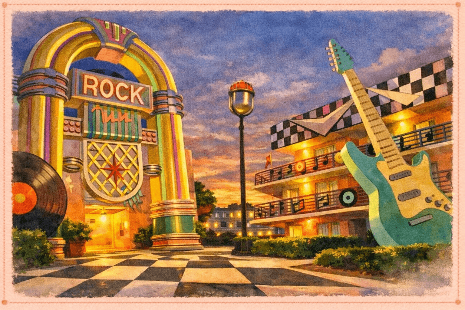 Only All-Star resort with family suites (sleeps 6 with kitchenette). Guitar-shaped Calypso Pool. Music-themed courtyards from jazz to rock. Quietest of the three All-Star resorts.