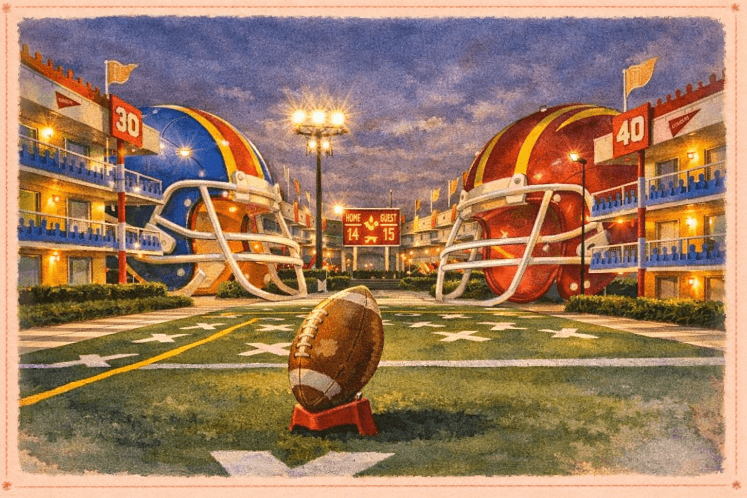 Cheapest on-property Disney hotel. Surfboard Bay Pool and Grand Slam Pool. Giant sports icons across five themed courtyards. Recently renovated rooms with queen beds and Murphy beds.